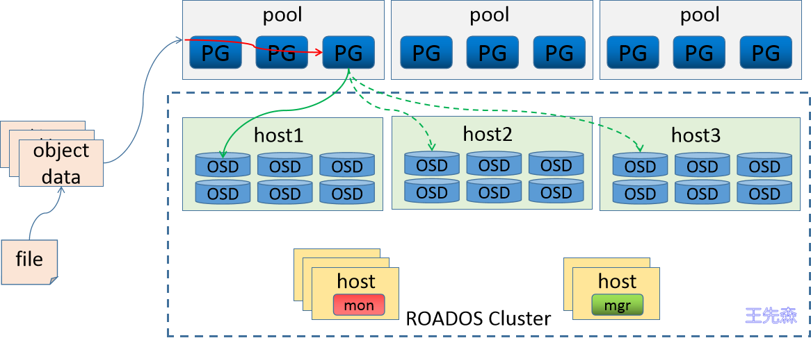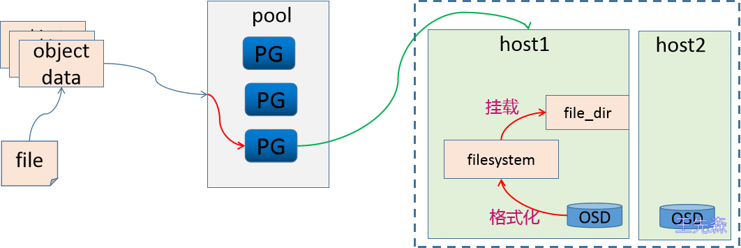注意:在Ceph中,每个文件都会被拆分为多个独立的object,再按上述逻辑持久化存储。