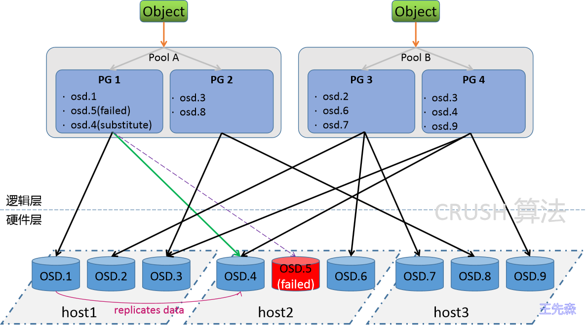 通过CRUSH算法决定该PG应存储在哪几个OSD上。CRUSH算法支持集群动态扩展、再平衡与恢复。