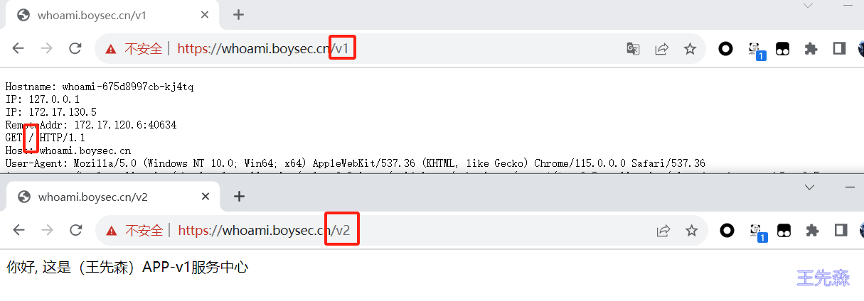 假设现在有这样一个需求,当访问 http://whoami.boysec.cn/v1 时,流量调度至 whoami。当访问 http://whoami.boysec.cn/v2 时,流量调度至 nginx。这种需求是非常常见的。