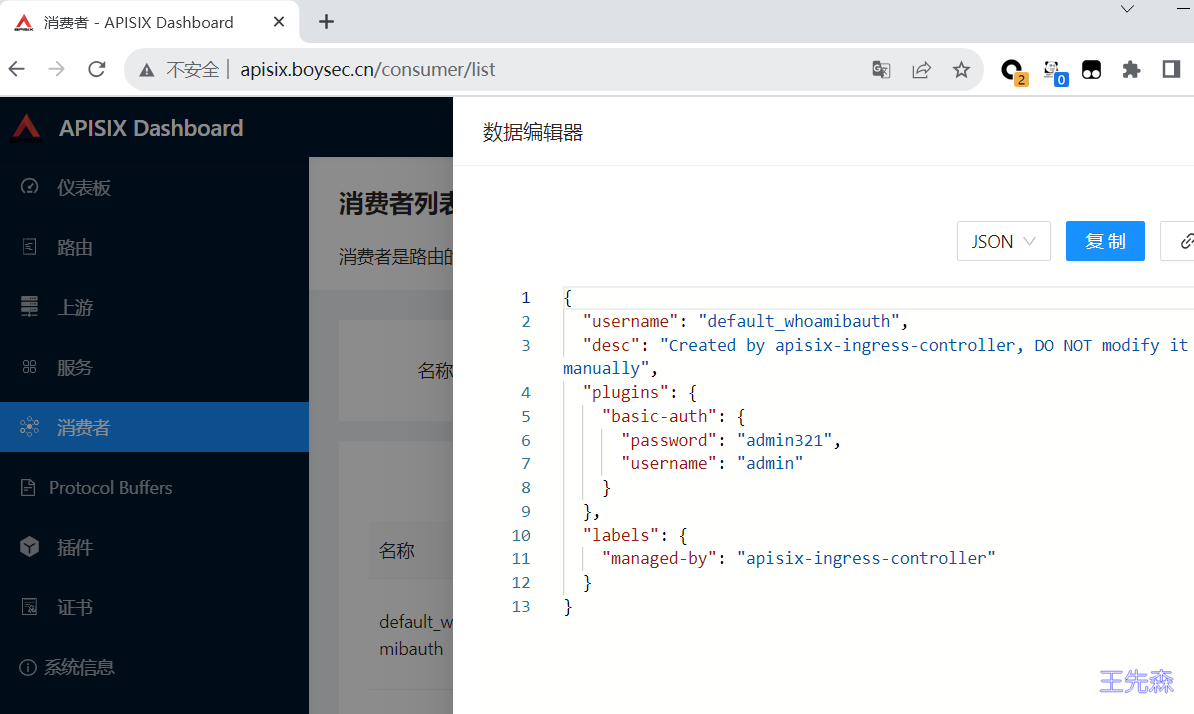 首先我们需要在 APISIX Consumer 消费者中增加 basic auth 认证配置,为其指定用户名和密码,我们这里在 APISIX Ingress 中,可以通过 ApisixConsumer 资源对象进行配置,比如这里我们为前面的 whoami实例应用添加一个基本认证,如下所示: