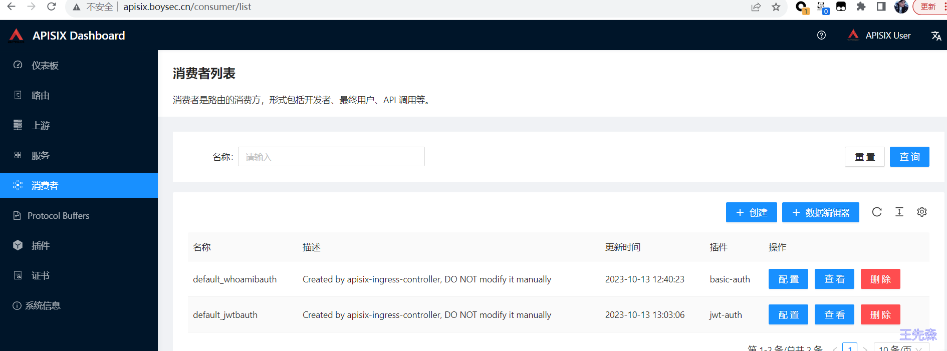 ApisixConsumer 资源对象中只需要配置 authParameter 认证参数即可,目前只支持 BasicAuth 与 KeyAuth 两种认证类型,在 basicAuth 下面可以通过 value 可直接去配置相关的 username 和 password,也可以直接使用 Secret 资源对象进行配置,比起明文配置会更安全一些。